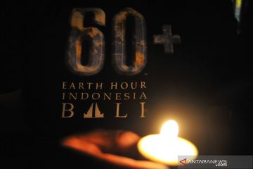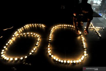 Warga menyalakan lilin membentuk angka 60 plus saat peringatan Earth Hour di Denpasar, Bali, Sabtu (27/3/2021). Aksi Earth Hour dengan mematikan lampu pada pukul 20.30 hingga 21.30 waktu setempat tersebut dilakukan di berbagai belahan dunia sebagai bentuk kepedulian terhadap kondisi bumi sekaligus sebagai kampanye untuk menghemat pemakaian listrik. ANTARA FOTO/Fikri Yusuf/hp.