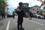 Petugas kepolisian berjaga di lokasi dugaan bom bunuh diri di depan Gereja Katolik Katedral, Makassar, Sulawesi Selatan, Minggu (28/3/2021). ANTARA FOTO/Abriawan Abhe/foc.