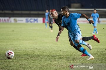 Pesepak bola Persela Lamongan F Womsimor (kanan) dan pesepak bola Madura United Jaime Xavier (kiri) mengejar bola saat pertandingan sepak bola Group C Piala Menpora di Stadion Si Jalak Harupat, Kabupaten Bandung, Jawa Barat, Kamis (1/4/2021). Pertandingan tersebut berakhir imbang dengan skor 1-1. ANTARA FOTO/M Agung Rajasa/aww.