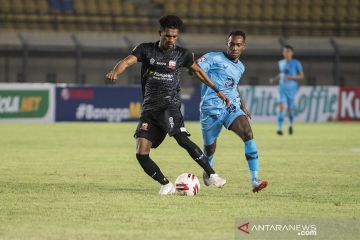 Pesepak bola Persela Lamongan IM Kosepa (kanan) berusaha merebut bola dari pesepak bola Madura United Alfin Tuasalamony (kiri) saat pertandingan sepak bola Group C Piala Menpora di Stadion Si Jalak Harupat, Kabupaten Bandung, Jawa Barat, Kamis (1/4/2021). Pertandingan tersebut berakhir imbang dengan skor 1-1. ANTARA FOTO/M Agung Rajasa/aww.