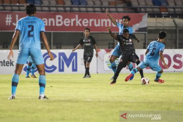 Tim pesepak bola Madura United merayakan kemenangan usai mencetak gol ke gawang Persela Lamongan saat pertandingan sepak bola Group C Piala Menpora di Stadion Si Jalak Harupat, Kabupaten Bandung, Jawa Barat, Kamis (1/4/2021). Pertandingan tersebut berakhir imbang dengan skor 1-1. ANTARA FOTO/M Agung Rajasa/aww.
