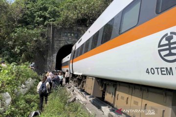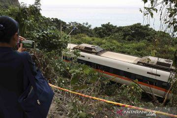 Seorang warga memotret rangkaian kereta yang anjlok di dalam sebuah terowongan di Hualien bagian utara, Taiwan, Jumat (2/4/2021). Kereta yang membawa sekitar 500 penumpang tersebut anjlok dan menewaskan sedikitnya 48 penumpang dan melukai 66 penumpang lainnya. ANTARA FOTO/REUTERS/Ann Wang/wsj.