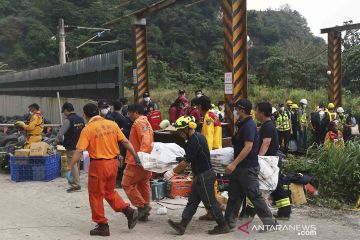 Personel SAR bertugas di lokasi anjloknya rangkaian kereta di dalam sebuah terowongan di Hualien bagian utara, Taiwan, Jumat (2/4/2021). Kereta yang membawa sekitar 500 penumpang tersebut anjlok dan menewaskan sedikitnya 48 penumpang dan melukai 66 penumpang lainnya. ANTARA FOTO/REUTERS/Ann Wang/wsj.