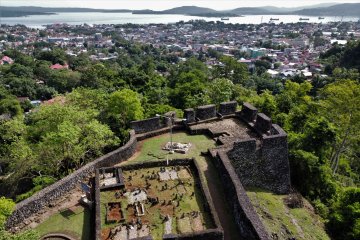 Foto udara kawasan Benteng Keraton Wolio di Kelurahan Melai, Kecamatan Betoambari, Kota Baubau, Sulawesi Tenggara, Sabtu (3/4/2021). Benteng Keraton Buton seluas 23,375 hektare itu merupakan salah satu objek wisata bersejarah andalan di Baubau. ANTARA FOTO/Jojon/aww.