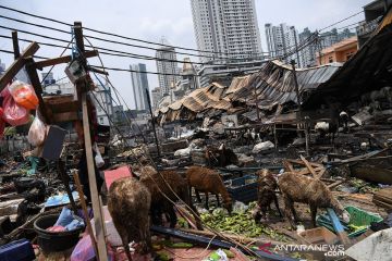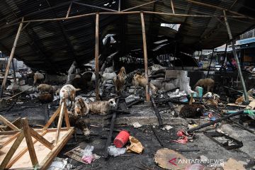 Sejumlah kambing berada di sisa-sisa kebakaran Pasar Lontar atau Pasar Kambing di Jalan Sabeni, Tanah Abang, Jakarta Pusat, Sabtu (10/4/2021). Sejumlah warga mulai membersihkan lapak mereka yang masih tersisa pasca kebakaran pada Kamis, 8 April lalu. ANTARA FOTO/Sigid Kurniawan/aww.