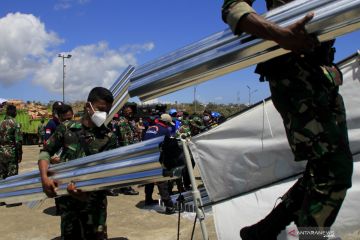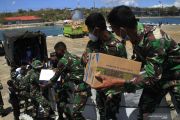 Personel TNI membawa sejumlah seng yang akan disalurkan ke korban bencana alam di Sabu Raijua, di dermaga Lantamal VII Kupang, NTT, Minggu (11/04/2021). Bantuan Logistik berupa, pakaian, makanan, terpal, selimut, air minum, serta seng dan kasur itu akan disalurkan untuk 346 jiwa warga Sabu Raijua yang masih berada di lokasi pengungsian akibat banjir bandang siklon tropis Seroja pada Minggu (4/4) lalu. ANTARA FOTO/Kornelis Kaha/hp.