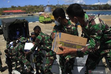 Sejumlah personel TNI menaikkan logistik ke atas KRI Ahmad Yani-351 untuk disalurkan ke korban bencana alam di Sabu Raijua, di dermaga Lantamal VII Kupang, NTT, Minggu (11/04/2021). Bantuan Logistik berupa, pakaian, makanan, terpal, selimut, air minum, serta seng dan kasur itu akan disalurkan untuk 346 jiwa warga Sabu Raijua yang masih berada di lokasi pengungsian akibat banjir bandang siklon tropis Seroja pada Minggu (4/4) lalu. ANTARA FOTO/Kornelis Kaha/hp.