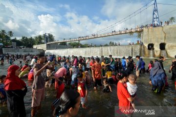 Sejumlah warga mandi-mandi di kawasan Cek Dam Koto Tuo, Padang, Sumatera Barat, Senin (12/4/2021). Warga menjalankan tradisi "Balimau", atau mensucikan diri menjelang memasuki satu Ramadhan dengan mandi bersama keluarga dan kerabat di sungai. ANTARA FOTO/Iggoy el Fitra/rwa.