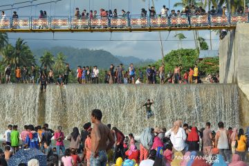 Dua remaja melompat di kawasan Cek Dam Koto Tuo, Padang, Sumatera Barat, Senin (12/4/2021). Warga menjalankan tradisi "Balimau", atau mensucikan diri menjelang memasuki satu Ramadhan dengan mandi bersama keluarga dan kerabat di sungai. ANTARA FOTO/Iggoy el Fitra/rwa.
