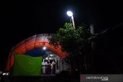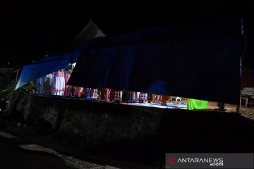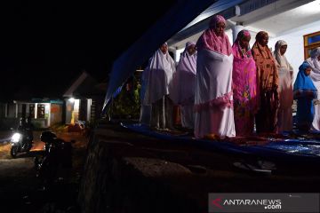 Warga melaksanakan shalat tarawih pertama Ramadhan di Desa Kaliuling, Lumajang, Jawa Timur, Senin (12/4/2021). Shalat tarawih tersebut dilaksanakan di tenda darurat yang dibangun warga di halaman rumah yang rusak akibat gempa pada Sabtu (10/4). ANTARA FOTO/Zabur Karuru/rwa.