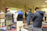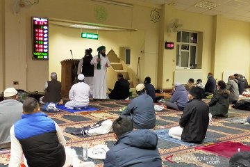 Sejumlah warga muslim mendengarkan ceramah ibadah tarawih pertama Ramadan tahun ini yang disampaikan oleh Saleem, Imam Masjid Madina Central Mosque Southampton, United Kingdom, pada Selasa (13/04/2021) malam. Pemerintah Inggris sudah memperbolehkan ibadah bersama di masjid, dengan tetap melakukan protokol kesehatan yang ketat dan diharuskan memakai masker, menjaga jarak sejauh 2 meter antar shaf jamaah, serta berwudlu dari rumah. Pihak pengelola masjid menutup toilet dan tempat wudlu, untuk meminimalisir resiko penularan Covid-19. ANTARA/Munawir Aziz/aa.