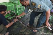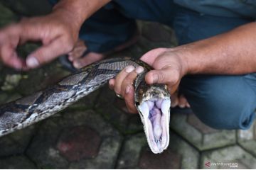 Petugas Balai Konservasi Sumber Daya Alam (BKSDA) Banten menunjukan seekor ular sanca batik (Phyton reticulatus) yang diamankan dari warga di Serang, Banten, Jumat (16/4/2021). Ular sepanjang 3,5 meter tersebut sebelumnya ditangkap warga setempat dari sebuah rumah yang terendam banjir. ANTARA FOTO/Asep Fathulrahman/hp.