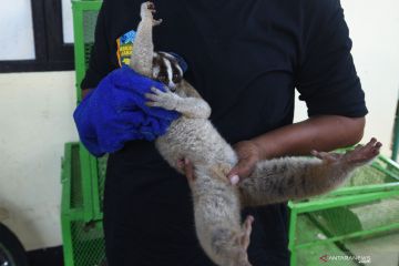 Petugas Balai Konservasi Sumber Daya Alam (BKSDA) Banten menunjukan seekor kukang jawa (Nycticebus javanicus) yang diamankan dari warga di Ciracas, Serang, Banten, Jumat (16/4/2021). Hewan dilindungi tersebut diserahkan warga setelah dilakukan pendekatan persuasif oleh petugas selanjutnya akan direhabilitasi untuk dilepasliarkan kembali ke habitat aslinya. ANTARA FOTO/Asep Fathulrahman/hp.