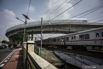 Kereta listrik melintas di bawah jalan layang (flyover) Cakung di Jakarta, Senin (19/4/2021). Pemprov DKI Jakarta melakukan uji coba tahap pertama pada jalan layang yang menghubungkan Kecamatan Cakung dengan Kecamatan Duren Sawit itu mulai 19-21 April 2021. ANTARA FOTO/Aprillio Akbar/wsj.