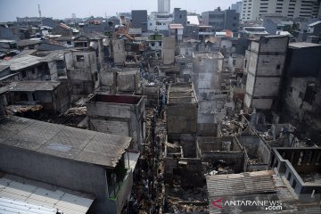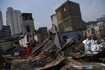 Suasana sisa permukiman yang terbakar di Keagungan, Taman Sari, Jakarta Barat, Senin (19/4/2021). Kebakaran permukiman padat yang terjadi pada Minggu 18 April 2021 tersebut mengakibatkan sebanyak 112 rumah hangus terbakar dan sekitar 1.000 warga terpaksa mengungsi. ANTARA FOTO/Sigid Kurniawan/aww.