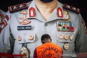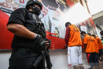 Tersangka dihadirkan saat pengungkapan kasus narkoba di Polda Metro Jaya, Jakarta, Senin (19/4/2021). Direktorat Reserse Narkoba Polda Metro Jaya mengamankan sembilan orang tersangka kasus narkoba dengan barang bukti berupa sabu 6.339 gram, ganja 3.000 gram dan 5.385 butir ekstasi. ANTARA FOTO/Rivan Awal Lingga/aww.
