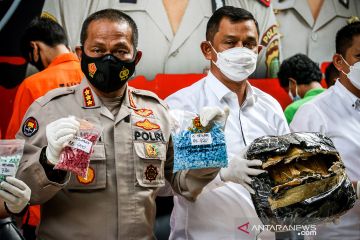 Kabid Humas Polda Metro Jaya Kombes Pol Yusri Yunus (kiri) didampingi Direktur Reserse Narkoba Polda Metro Jaya Kombes Pol Mukti Juharsa (kanan) menunjukkan barang bukti saat memberikan keterangan pers terkait pengungkapan kasus narkoba di Polda Metro Jaya, Jakarta, Senin (19/4/2021). Direktorat Reserse Narkoba Polda Metro Jaya mengamankan sembilan orang tersangka kasus narkoba dengan barang bukti berupa sabu 6.339 gram, ganja 3.000 gram dan 5.385 butir ekstasi. ANTARA FOTO/Rivan Awal Lingga/aww.