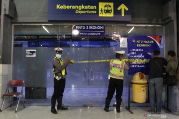 Tim Inafis Polrestabes Surabaya memasang garis polisi di lokasi ambruknya langit-langit di Ruang Keberangkatan Kereta Api Ekonomi di Stasiun Pasar Turi Surabaya, Jawa Timur, Selasa (20/4/2021). Pihak kepolisian setempat masih melakukan penyelidikan kasus ambruknya langit-langit di bagian stasiun tersebut. ANTARA FOTO/Didik Suhartono/hp.