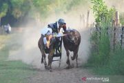 Warga menyaksikan joki memacu sapi saat dilatih di Desa Mortajih, Pamekasan, Jawa Timur, Minggu (25/4/2021). Selain untuk meningkatkan kecepatan sapi, latihan karapan sapi saat Ramadhan itu juga menjadi tontonan warga sambil menunggu datangnya buka puasa atau ngabuburit. FOTOTARA FOTO/Saiful Bahri/aww.