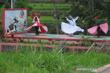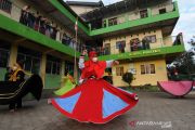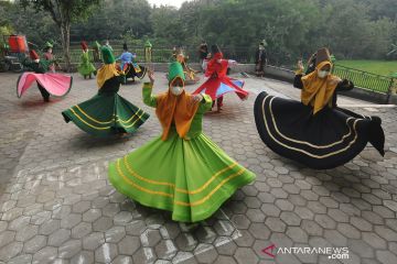 Sejumlah santri menari tarian sufi di Pondok Pesantren Nurul Hidayah Al Mubarokah, Sempu, Andong, Boyolali, Jawa Tengah, Minggu (25/4/2021). Untuk mengisi waktu ngabuburit menanti berbuka puasa, para santri dan santriwati berlatih pengembangan bakat kesenian dengan berlatih tari sufi. ANTARA FOTO/Aloysius Jarot Nugroho/aww.