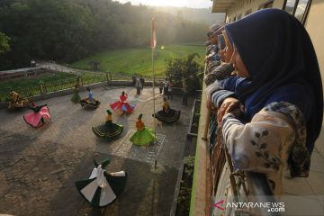 Sejumlah santriwati melihat temannya saat berlatih tarian sufi di Pondok Pesantren Nurul Hidayah Al Mubarokah, Sempu, Andong, Boyolali, Jawa Tengah, Minggu (25/4/2021). Untuk mengisi waktu ngabuburit menanti berbuka puasa, para santri dan santriwati berlatih pengembangan bakat kesenian dengan berlatih tari sufi. ANTARA FOTO/Aloysius Jarot Nugroho/aww.