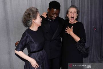 Pemenang Piala Oscar 2021 kategori Best Actress Frances McDormand (kanan), kategori Best Actor in a supporting role Daniel Kaluuya (tengah) dan kategori Best Actress for suporting role Yuh-Jung Youn berfoto usai penyerahan penghargaan di Los Angeles, California, AS, Minggu (25/4/2021). ANTARA FOTO/Chris Pizzello/Pool via REUTERS/foc.