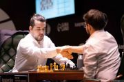 GM Ian Nepomniachtchi (kiri) dari Rusia berjabat-tangan dengans GM Maxime Vachier-Lagrave dari Prancis saat mereka bertanding catur dalam Turnamen Kandidat 2021, di Yekaterinburg, Rusia, Senin (26/4/2021). ANTARA FOTO/HO-FIDE via Reuters- Lennart Ootes/hp.