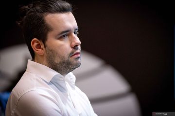 GM Ian Nepomniachtchi dari Rusia menunggu lawannya GM Maxime Vachier-Lagrave dari Prancis menjalankan bidak catur dalam Turnamen Kandidat 2021, di Yekaterinburg, Rusia, Senin (26/4/2021). ANTARA FOTO/HO-FIDE via Reuters- Lennart Ootes/hp.