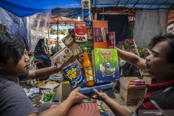 Pedagang bersiap mengirimkan parsel ke pembeli di kawasan Cikini, Jakarta, Selasa (27/4/2021). Pedagang parsel musiman di kawasan tersebut menjual harga parsel kisaran Rp150 ribu hingga Rp3 juta tergantung dari model parsel yang diminta pembeli. ANTARA FOTO/Aprillio Akbar/foc.