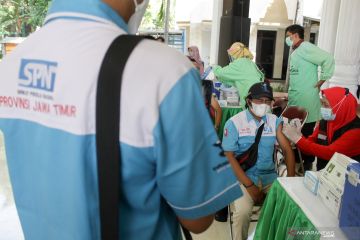 Petugas menyuntikkan vaksin ke salah satu pekerja pada vaksin untuk pekerja dan lansia di halaman DPRD Provinsi Sumsel Palembang, Sumsel, Sabtu (1/5/2021). Polda Sumsel bersama Dinas Kesehatan Provinsi Sumsel menggelar vaksin bagi pekerja dan lansia dalam rangka hari buruh 1 Mei. ANTARA FOTO/Feny Selly/hp.