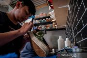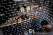 Pekerja membersihkan sepatu pelanggan di Rangkasbitung, Lebak, Banten, Sabtu (5/1/2021). Bisnis jasa cuci sepatu dengan pelayanan pencucian dan pewarnaan itu mampu melayani 10 hingga 20 pasang sepatu per hari dengan tarif Rp25.000 hingga Rp150.000 per pasang sepatu. ANTARA FOTO/Muhammad Bagus Khoirunas/rwa.