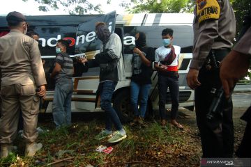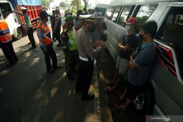 Personel kepolisian memeriksa sejumlah penumpang travel gelap saat pengetatan mudik di jalur Selatan Tegal-Purwokerto, Klonengan, Kabupaten Tegal, Jawa Tengah, Minggu (2/5/2021). Pengetatan jalur mudik oleh Satlantas Polres Tegal tersebut mengamankan delapan mobil travel gelap yang membawa penumpang dari Jakarta dan memutar balik puluhan kendaraan pribadi pemudik awal terkait larangan mudik oleh pemerintah. ANTARA FOTO/Oky Lukmansyah/wsj.
