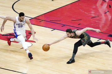 Pebasket Chicago Bulls Tomas Satoransky (kanan) merebut bola dari pebasket Philadelphia 76ers Ben Simmons (kiri) dalam laga lanjutan NBA, di United Center, Chicago, Illinois, Amerika Serikat, Senin (3/5//2021). ; Philadelphia 76ers berhasil mengalahkan Chicago Bulls 106 - 94. ANTARA FOTO/Reuters-Mike Dinovo-USA TODAY Sports/hp.