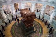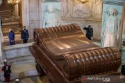 Presiden Prancis Emmanuel Macron dan istrinya Brigitte Macron berdiri di depan makam Napoleon dalam upacara peringatan 200 tahun kematian Napoleon Bonaparte di Hotel des Invalides, Paris, Prancis, Rabu (5/5/2021). ANTARA FOTO / Pool via REUTERS / Christophe Petit Tesson / rwa.
