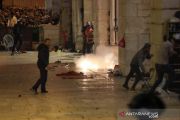 Warga Palestina bereaksi ketika polisi Israel menembakkan granat setrum selama bentrokan di kompleks Masjid Al Aqsa, di Yerusalem, (7/5/2021). Bentrokan tersebut imbas ketegangan di Yerusalem yang meningkat karena warga Palestina memprotes pembatasan akses Israel ke beberapa bagian Kota Tua Yerusalem selama bulan suci Ramadhan dan beberapa keluarga Palestina diperintahkan untuk meninggalkan rumah mereka, untuk memberi jalan bagi pemukim Israel. ANTARA FOTO/REUTERS / Ammar Awad/aww.