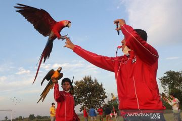 Anggota komunitas 'Kediri Free Flight Community' menerbangkan burung Macaw (Ara macao) di Lapangan Semampir, Kota Kediri, Jawa Timur, Sabtu (8/5/2021). Latihan bersama menerbangkan burung paruh bengkok tersebut guna menjaga kondisi kebugaran burung sekalius sebagai sarana silaturahmi anggota komunitas penggemar burung 'free flight'. ANTARA FOTO/Prasetia Fauzani/rwa.