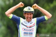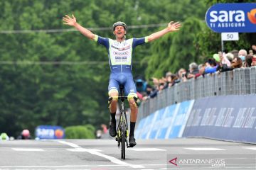 Pembalap sepeda tim Intermarche-Wanty-Gobert Materiaux Taco Van Der Hoorn mengekspresikan kegembiraannya setelah memenangi balap sepeda Giro d'Italia Stage 3 dengan rute Biella ke Canale, di Italia (10/5/2021). ANTARA FOTO/REUTERS/Jennifer Lorenzini/aww.