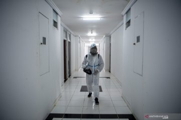 Pegawai Dinas Kesehatan Provinsi Sumatera Selatan menyemprotkan cairan disinfektan di rumah sehat COVID-19 Wisma Atlet Tower 8, Jakabaring Sport City (JSC), Palembang, Sumatera Selatan, Rabu (12/5/2021). Pemerintah Provinsi Sumatera Selatan menjadikan Wisma Atlet Tower 8 JSC sebagai tempat isolasi dan pengobatan pasien COVID-19 sebagai langkah untuk menambah ketersediaan tempat tidur (bed occupancy rate) di Kota Palembang yang telah menyentuh angka 70 persen. ANTARA FOTO/Nova Wahyudi/wsj.