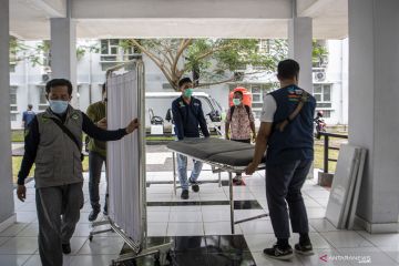 Petugas dari Dinas Kesehatan Provinsi Sumatera Selatan menyiapkan peralatan medis di rumah sehat COVID-19 Wisma Atlet Tower 8, Jakabaring Sport City (JSC), Palembang, Sumatera Selatan, Rabu (12/5/2021). Pemerintah Provinsi Sumatera Selatan menjadikan Wisma Atlet Tower 8 JSC sebagai tempat isolasi dan pengobatan pasien COVID-19 sebagai langkah untuk menambah ketersediaan tempat tidur (bed occupancy rate) di Kota Palembang yang telah menyentuh angka 70 persen. ANTARA FOTO/Nova Wahyudi/wsj.