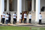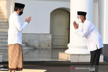 Presiden Joko Widodo menyambut salam pengawal dengan tetap menjaga jarak saat melaksanakan salat Idulfitri 1442 H di halaman Gedung Induk Istana Kepresidenan Bogor, Jawa Barat, pada Kamis pagi, (13 Mei 2021). Salat Idulfitri kali ini dilaksanakan dengan tetap memperhatikan protokol kesehatan secara ketat dengan melakukan pemeriksaan suhu tubuh dan menjaga jarak antarjemaah. ANTARA/HO-Biro Pers Sekretariat Presiden/Lukas/aa.