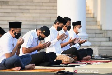Presiden Joko Widodo dan Ibu Negara Iriana Joko Widodo, melaksanakan salat Idulfitri 1442 H di halaman Gedung Induk Istana Kepresidenan Bogor, Jawa Barat, pada Kamis pagi, (13 Mei 2021). Salat Idulfitri kali ini dilaksanakan dengan tetap memperhatikan protokol kesehatan secara ketat dengan melakukan pemeriksaan suhu tubuh dan menjaga jarak antarjemaah. ANTARA/HO-Biro Pers Sekretariat Presiden/Lukas/aa.