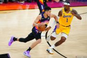 Pebasket Phoenix Suns Devin Booker (kiri) berupaya melewati penjagaan pebasket Los Angeles Lakers Kentavious Caldwell-Pope (kanan) dalam laga game kedua babak Playoff NBA, di Phoenix Suns Arena, Arizona, Amerika Serikat, Selasa (25/5/2021), LA Lakers berhasil memenangkan pertandingan ini atas Phoenix Suns 109 - 102. ANTARA FOTO/Reuters-Mark J. Rebilas-USA TODAY Sports/hp.