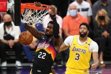 Pebasket Phoenix Suns Deandre Ayton (kiri) memasukkan bola dengan slam dunks saat melawan Los Angeles Lakers dalam laga game kedua babak Playoff NBA, di Phoenix Suns Arena, Arizona, Amerika Serikat, Selasa (25/5/2021), LA Lakers berhasil memenangkan pertandingan ini atas Phoenix Suns 109 - 102. ANTARA FOTO/Reuters-Mark J. Rebilas-USA TODAY Sports/hp.