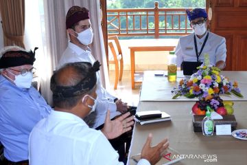 Menteri Pariwisata dan Ekonomi Kreatif (Menparekraf) Sandiaga Salahuddin Uno (kanan) menerima audiensi pelaku pariwisata saat "Work from Bali' di Politeknik Pariwisata Bali, Nusa Dua, Badung, Bali, Kamis (27/5/2021). Menparekraf Sandiaga Uno bersama jajarannya melakukan 'Work from Bali' atau bekerja dari Bali serta mendukung program 'Work from Bali' yang dicanangkan Kementerian Koordinator Kemaritiman dan Investasi agar dapat direalisasikan sebagai salah satu upaya untuk membantu pemulihan sektor pariwisata dan ekonomi kreatif Bali yang terdampak pandemi COVID-19. ANTARA FOTO/Fikri Yusuf/aww.