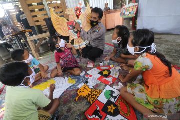 Kapolsek Puncu AKP Bowo Wicaksono (kiri) membimbing anak-anak merangkai Lambang Negara Indonesia Garuda Pancasila menggunakan kertas karton di Desa Gadungan, Kediri, Jawa Timur, Senin (31/5/2021). Kegiatan yang diikuti sejumlah anak-anak usia sekolah dasar tersebut digelar untuk memperkenalkan Lambang Negara Indonesia sekaligus menyambut peringatan Hari Lahir Pancasila yang jatuh setiap tanggal 1 Juni. ANTARA FOTO/Prasetia Fauzani/wsj.