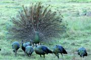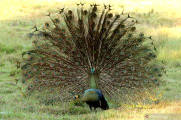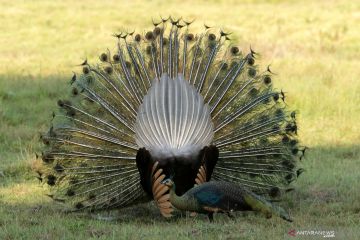 Merak hijau (Pavo muticus) jantan mengembangkan bulu ekornya untuk menarik perhatian merak betina di Savana Sadengan, Taman Nasional Alas Purwo, Banyuwangi, Jawa Timur, Senin (31/5/2021). Saat ini di Taman Nasional Alas Purwo memasuki musim kawin merak hijau yang diperkirakan berlangsung hingga bulan september. ANTARA FOTO/Budi Candra Setya/wsj.