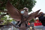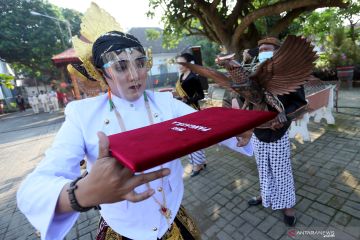 Budayawan membawa patung Garuda Pancasila saat mengikuti Upacara budaya Grebeg Pancasila di halaman Museum Istana Gebang Blitar, Jawa Timur, Selasa (1/6/2021). Untuk menghindari adanya kerumunan masyarakat yang bisa menyebabkan penularan COVID-19, pemda setempat meniadakan kirab Grebeg Pancasila yang sebelumnya rutin dilaksanakan dalam memperingati hari lahirnya Pancasila dan menggantinya dengan menggelar upacara budaya dengan menerapkan protokol kesehatan ketat. ANTARA FOTO/Irfan Anshori/hp.