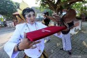Budayawan membawa naskah Pancasila saat Upacara budaya Grebeg Pancasila di halaman Museum Istana Gebang Blitar, Jawa Timur, Selasa (1/6/2021). Untuk menghindari adanya kerumunan masyarakat yang bisa menyebabkan penularan COVID-19, pemda setempat meniadakan kirab Grebeg Pancasila yang sebelumnya rutin dilaksanakan dalam memperingati hari lahirnya Pancasila dan menggantinya dengan menggelar upacara budaya dengan menerapkan protokol kesehatan ketat. ANTARA FOTO/Irfan Anshori/hp.