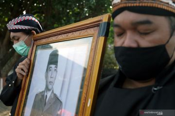 Budayawan mengheningkan cipta saat mengikuti Upacara budaya Grebeg Pancasila di halaman Museum Istana Gebang Blitar, Jawa Timur, Selasa (1/6/2021). Untuk menghindari adanya kerumunan masyarakat yang bisa menyebabkan penularan COVID-19, pemda setempat meniadakan kirab Grebeg Pancasila yang sebelumnya rutin dilaksanakan dalam memperingati hari lahirnya Pancasila dan menggantinya dengan menggelar upacara budaya dengan menerapkan protokol kesehatan ketat. ANTARA FOTO/Irfan Anshori/hp.