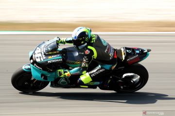 Pebalap Petronas Yamaha SRT Valentino Rossi memacu motornya saat sesi latihan sebelum berlangsung sesi kualifikasi MotoGP Catalunya, di Sirkuit Barcelona, Spanyol, Sabtu (5/6/2021). ANTARA FOTO/Reuters-Albert Gea/hp.